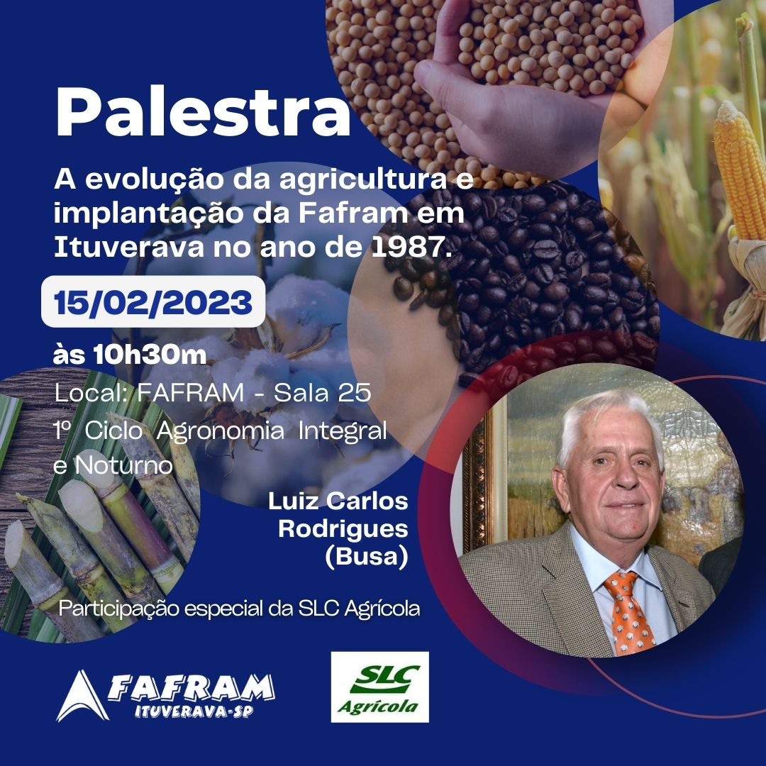 A FAFRAM tem o prazer de convidar todos os alunos do 1º ciclo de Engenharia Agronômica Integral e Noturno para participarem de uma palestra especial. A palestra, intitulada "A evolução da agricultura e implantação da FAFRAM em Ituverava no ano de 1987", será realizada no dia 15 de fevereiro de 2023, às 10:30, na Sala 25 da FAFRAM.